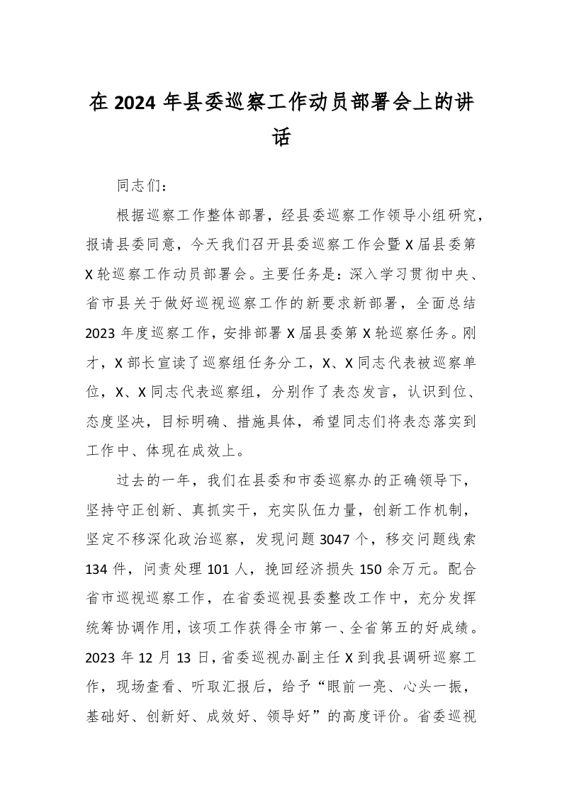 / 在2024年县委巡察工作动员部署会上的讲话稿