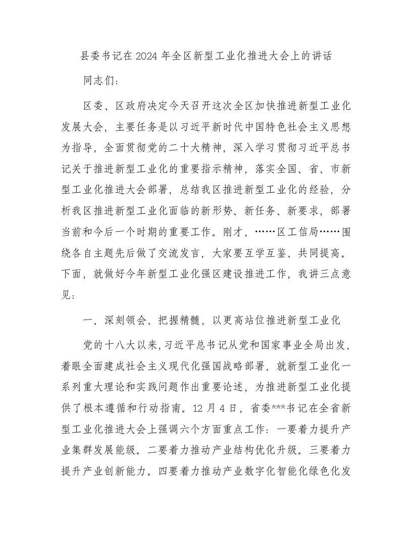 / 县委书记在2024年全区新型工业化推进大会上的讲话