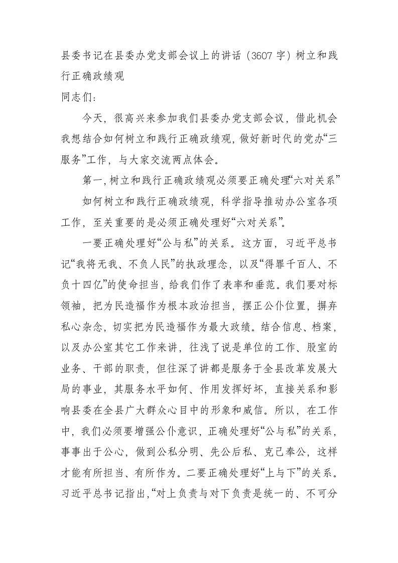 / 县委书记在县委办党支部会议上的讲话(树立和践行正确政绩观