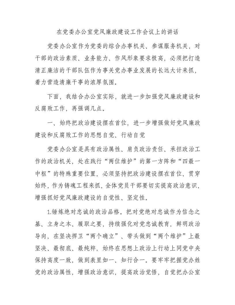 / 在党委办公室党风廉政建设工作会议上的讲话