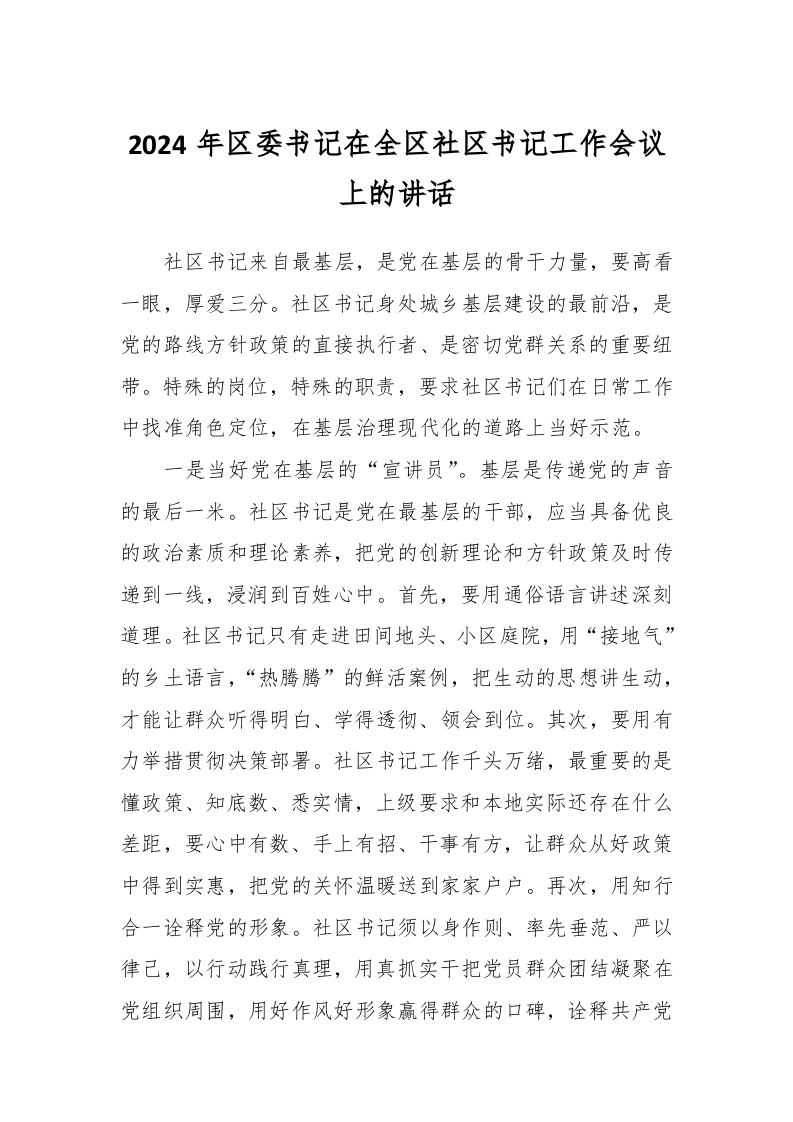 2024年区委书记在全区社区书记工作会议上的讲话稿