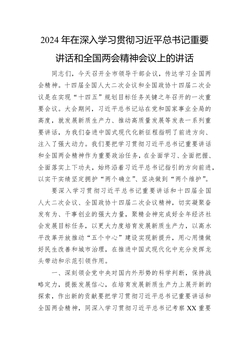 / 2024年在深入学习贯彻习近平总书记重要讲话稿和全国两会精神会议上的讲话稿