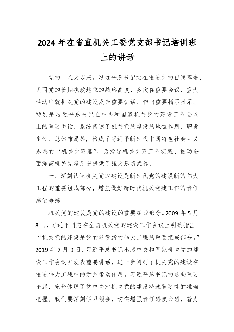 / 2024年在省直机关工委党支部书记培训班上的讲话稿