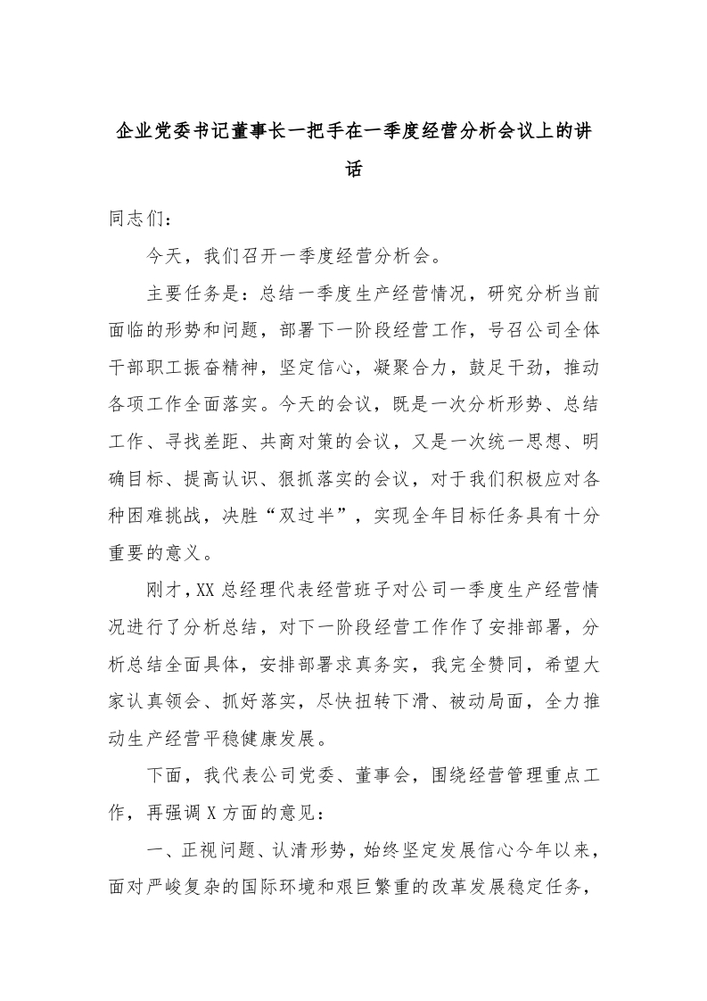 / 企业党委书记董事长一把手在一季度经营分析会议上的讲话稿