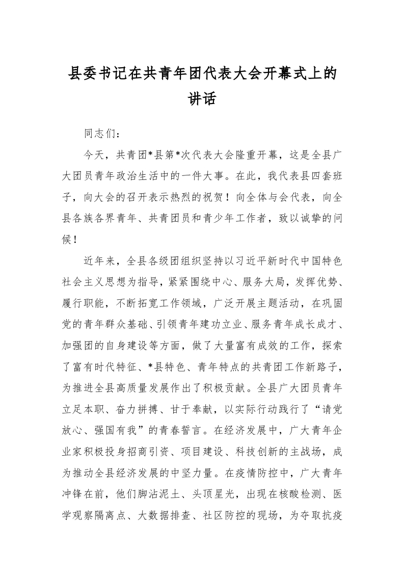 / 县委书记在共青年团代表大会开幕式上的讲话稿