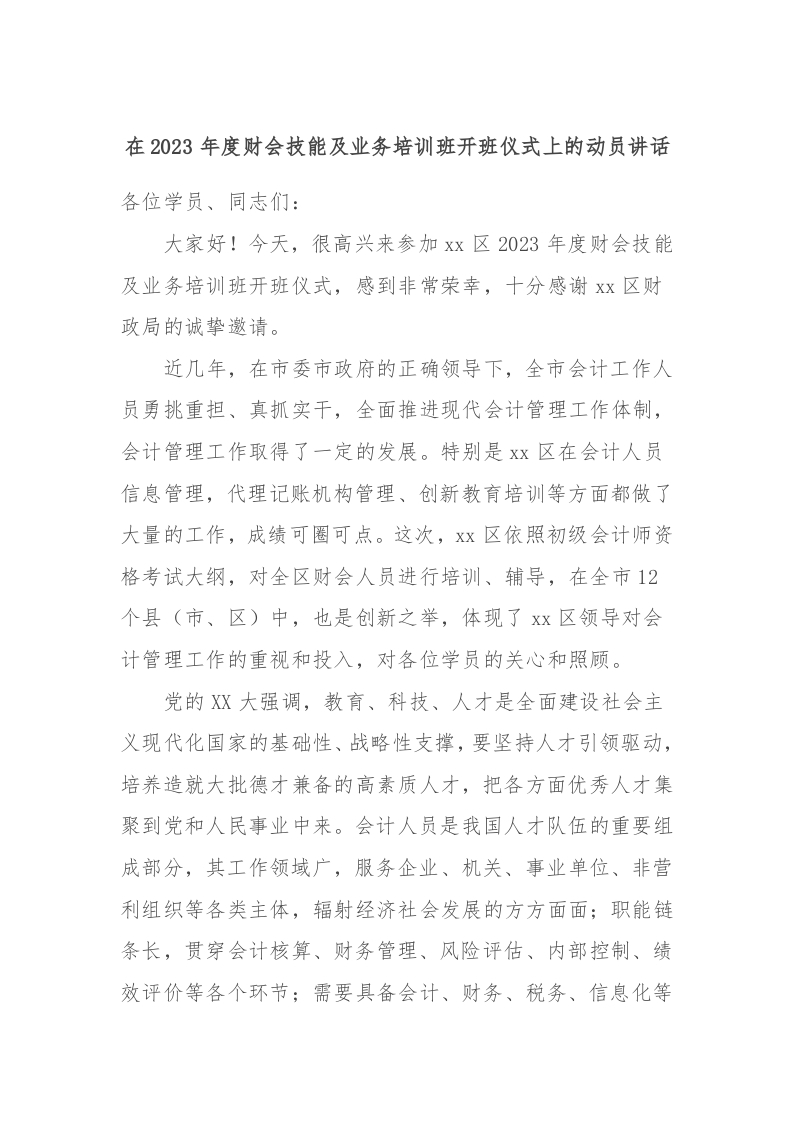 / 在2023年度财会技能及业务培训班开班仪式上的动员讲话稿