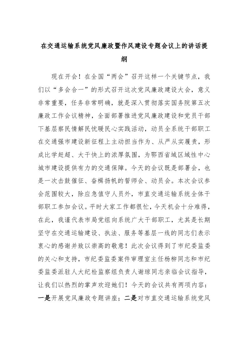 / 在交通运输系统党风廉政暨作风建设专题会议上的讲话稿提纲