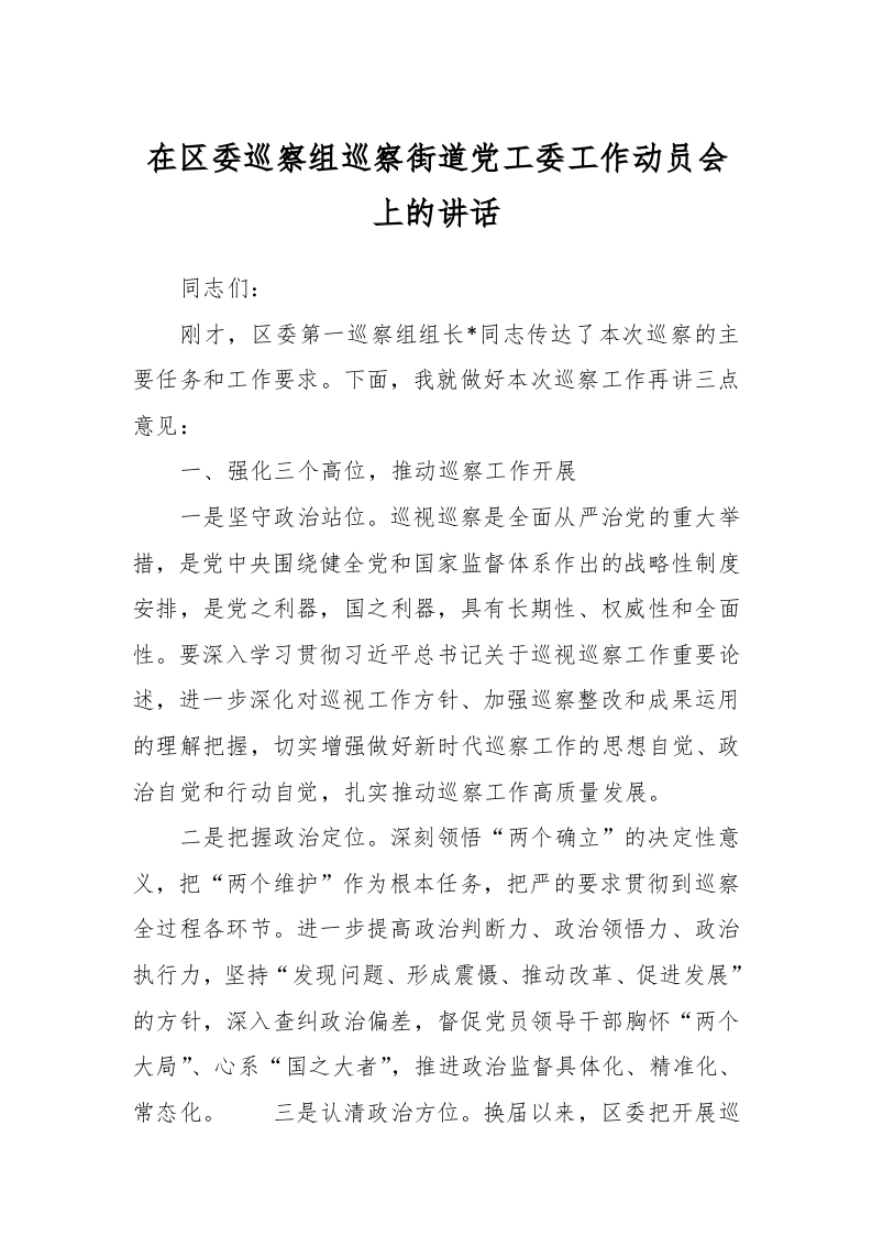 在区委巡察组巡察街道党工委工作动员会上的讲话稿