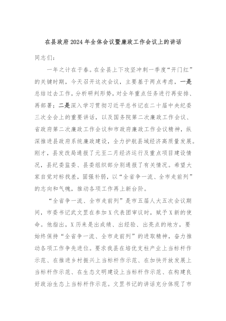 / 在县政府2024年全体会议暨廉政工作会议上的讲话稿