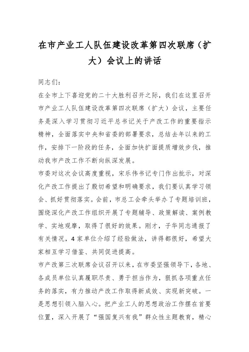 / 在市产业工人队伍建设改革第四次联席(扩大)会议上的讲话稿