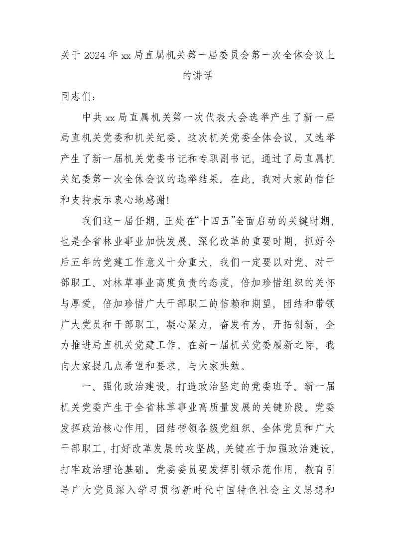 / 关于2024年xx局直属机关第一届委员会第一次全体会议上的讲话