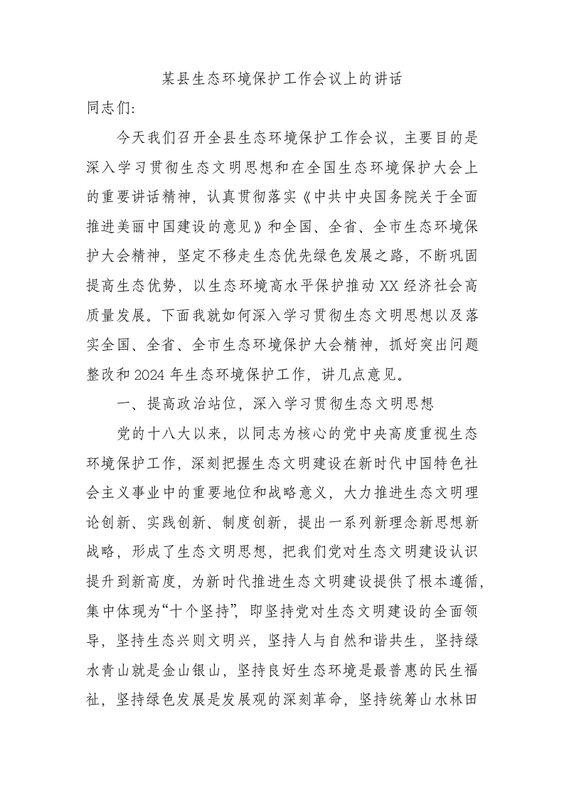 / 某县生态环境保护工作会议上的讲话