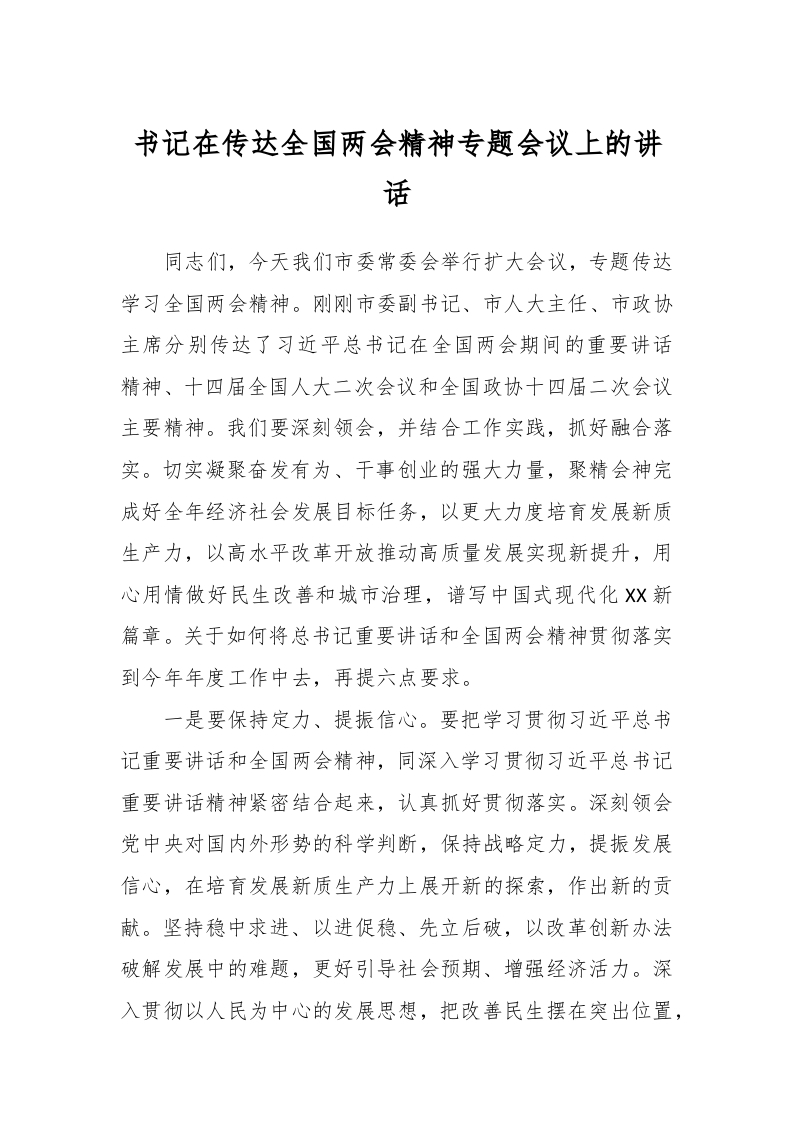 书记在传达全国两会精神专题会议上的讲话.