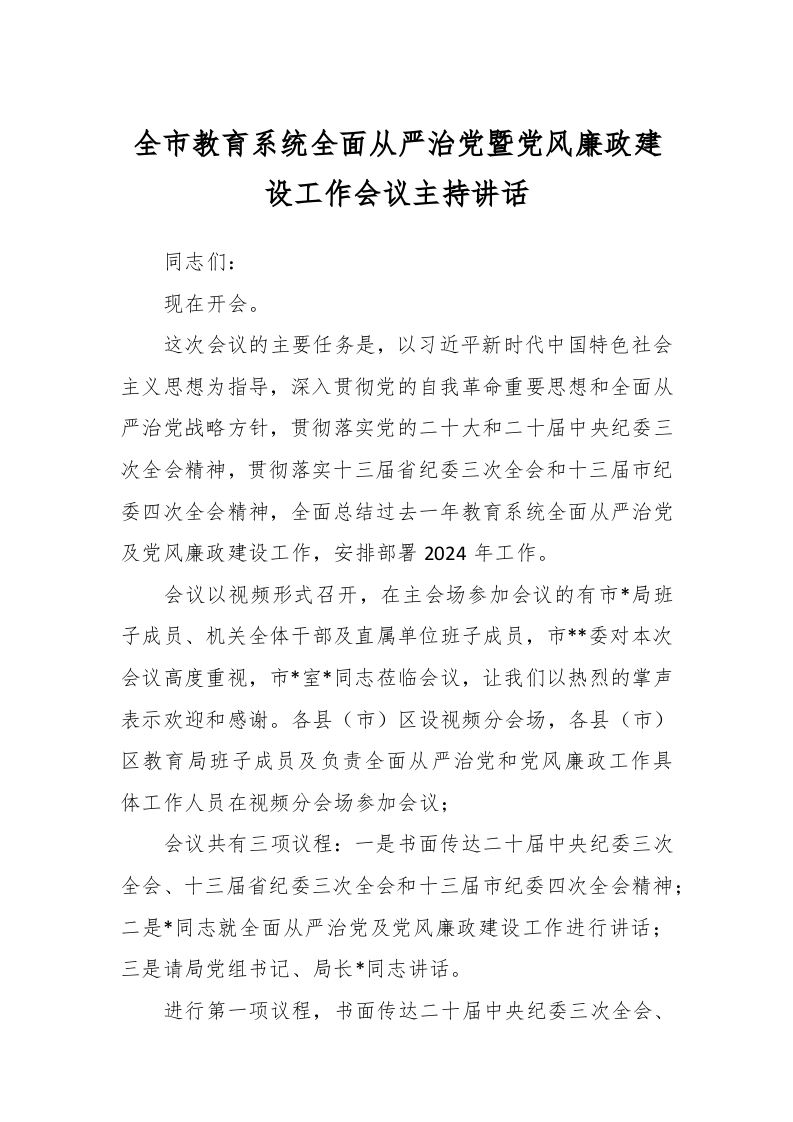 / 全市教育系统全面从严治党暨党风廉政建设工作会议主持讲话