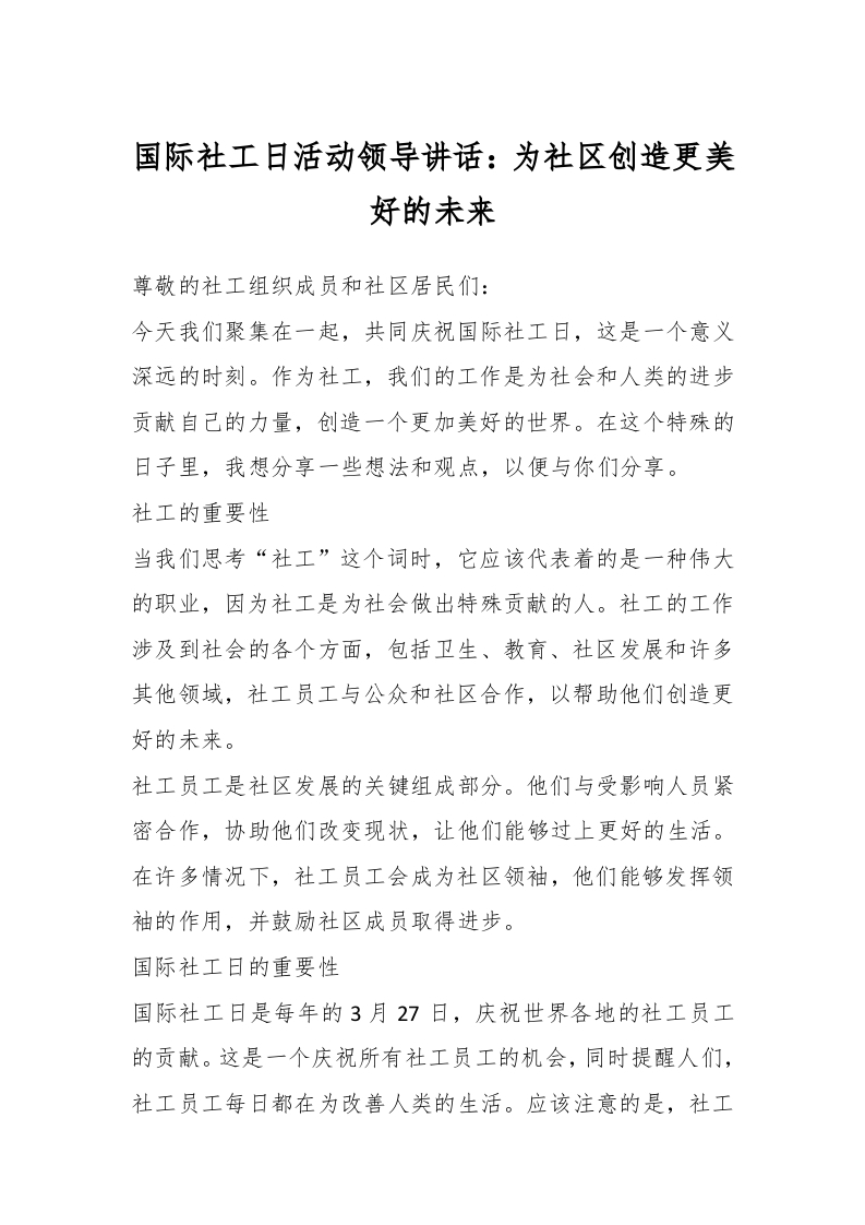 / 国际社工日活动领导讲话:为社区创造更美好的未来