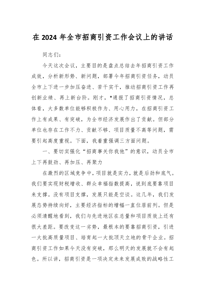 / 在2024年全市招商引资工作会议上的讲话