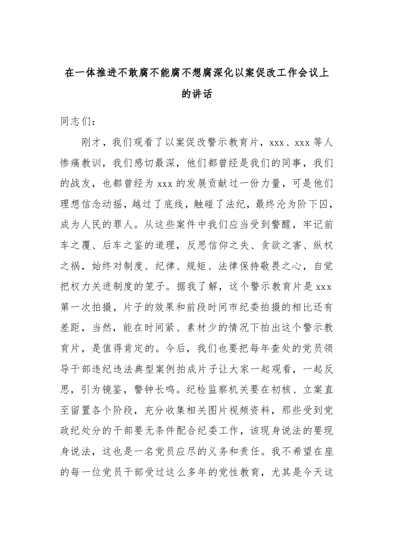 / 在一体推进不敢腐不能腐不想腐深化以案促改工作会议上的讲话