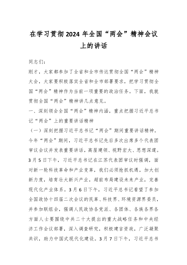 在学习贯彻2024年全国“两会”精神会议上的讲话.