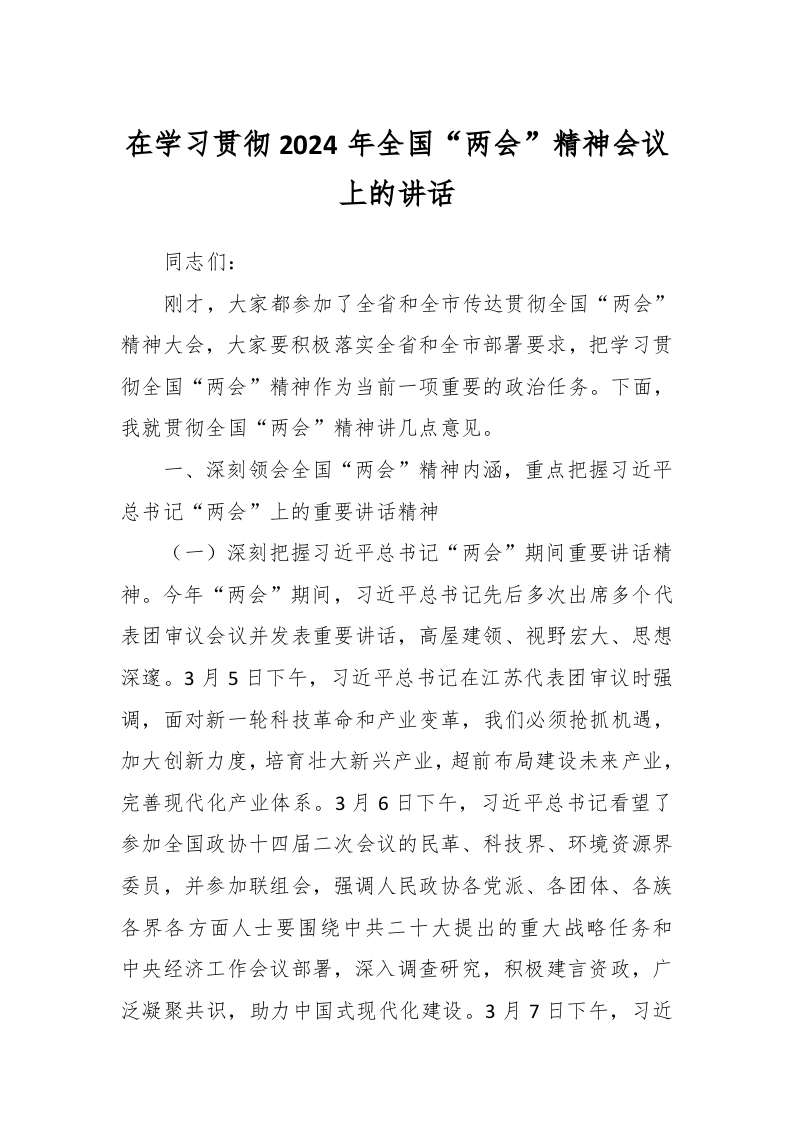 在学习贯彻2024年全国“两会”精神会议上的讲话.