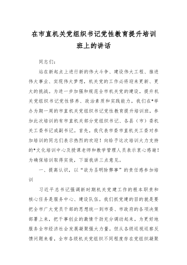 / 在市直机关党组织书记党性教育提升培训班上的讲话