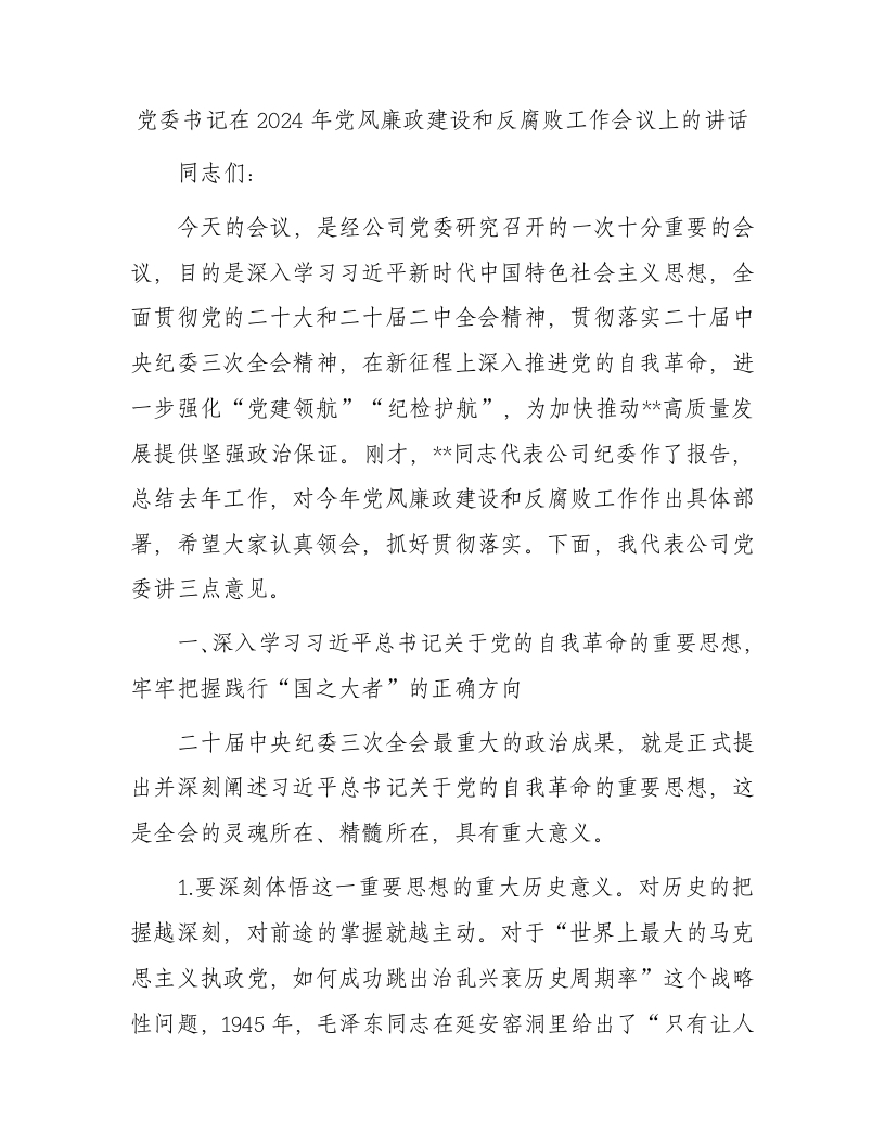 / 党委书记在2024年党风廉政建设和反腐败工作会议上的讲话