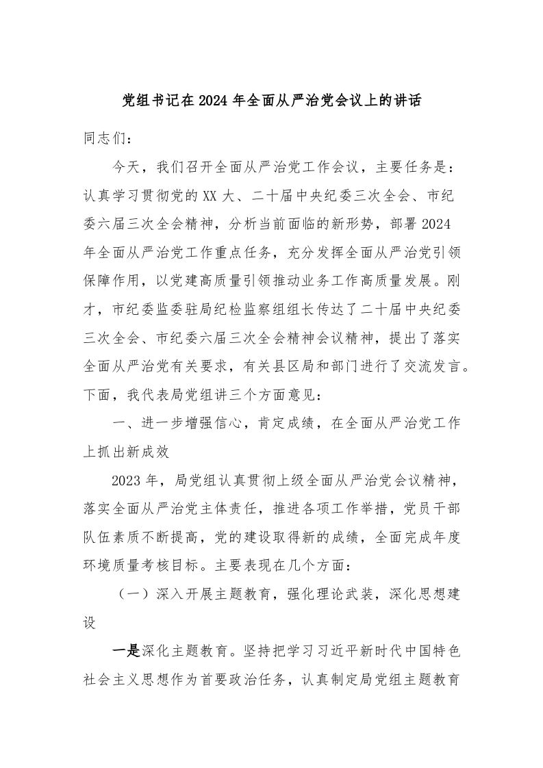 / 党组书记在2024年全面从严治党会议上的讲话稿