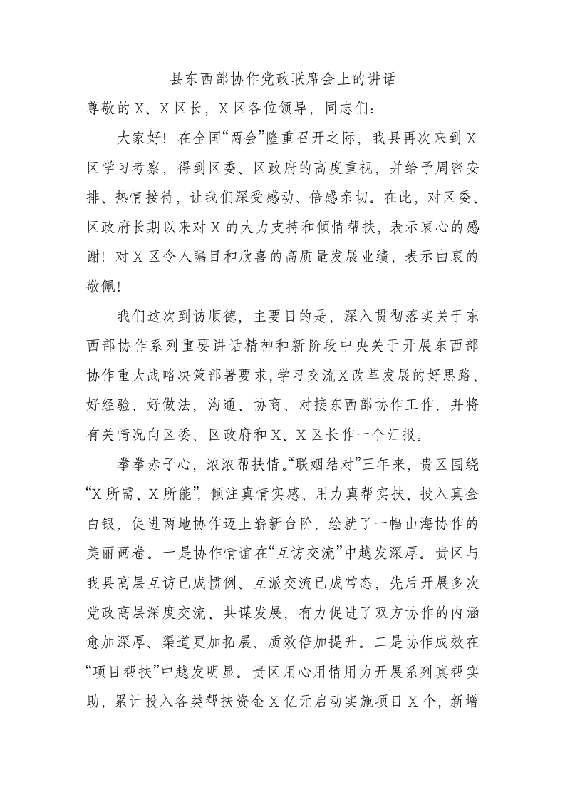 / 县东西部协作党政联席会上的讲话