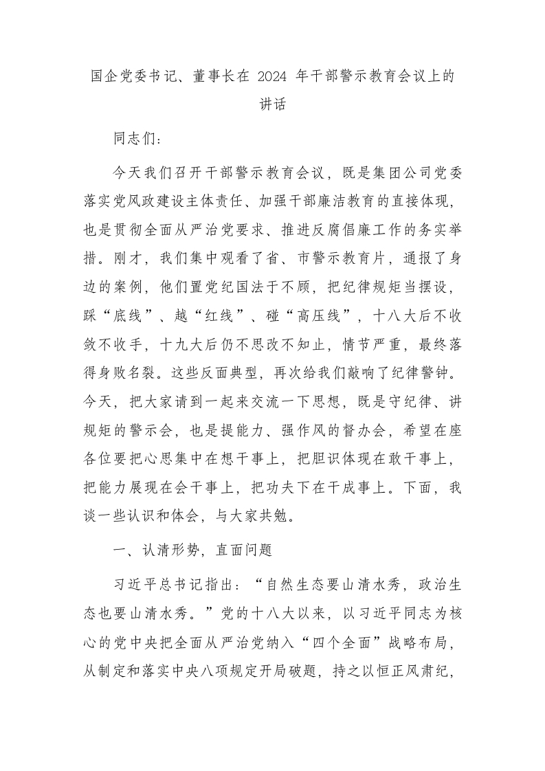 / 国企公司2024年干部警示教育会议上的讲话