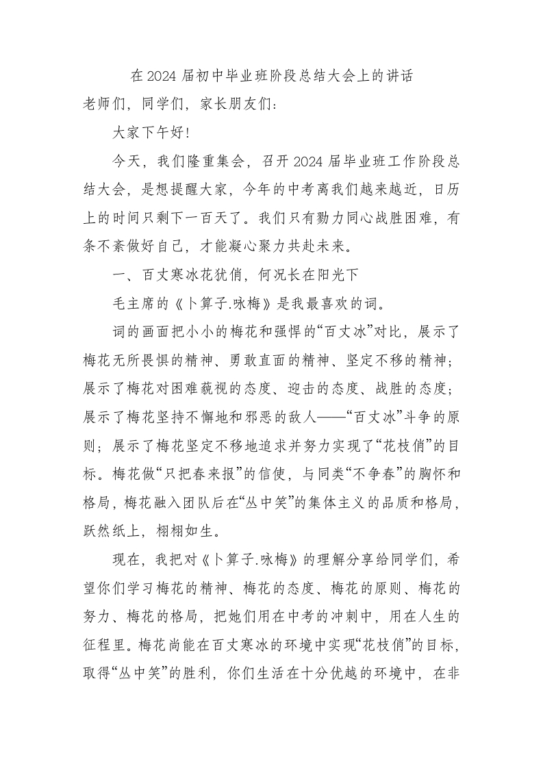/ 在2024届初中毕业班阶段总结大会上的讲话