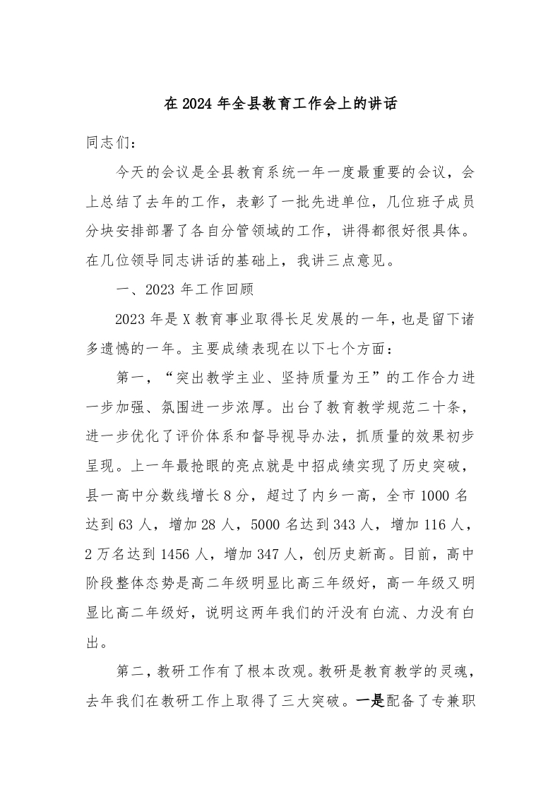 / 在2024年全县教育工作会上的讲话稿