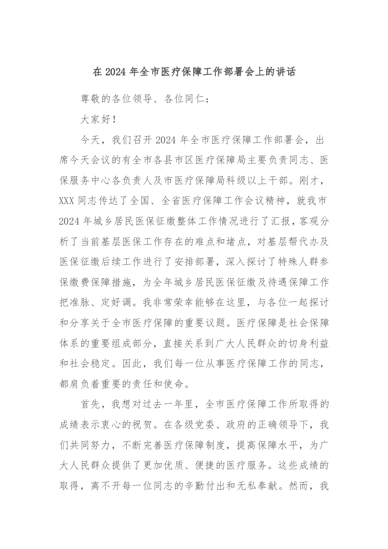 / 在2024年全市医疗保障工作部署会上的讲话稿