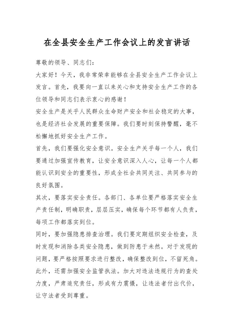 / 在全县安全生产工作会议上的发言稿讲话稿