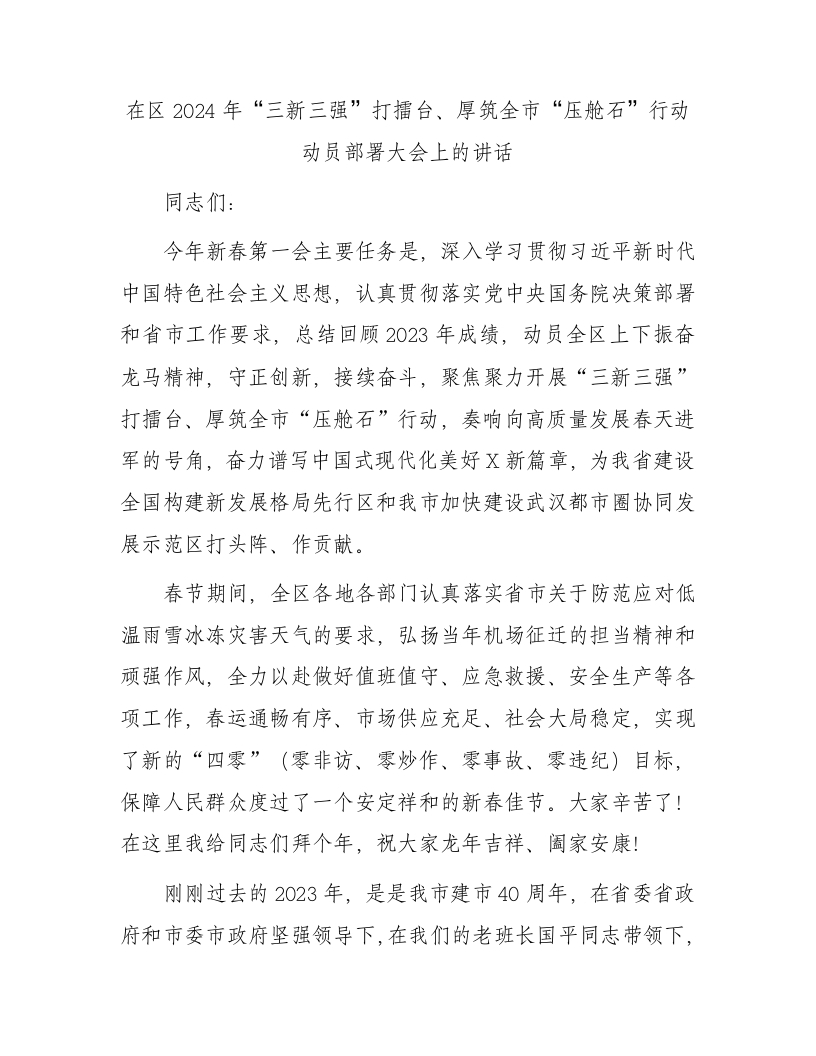 / 在区2024年“三新三强”打擂台、厚筑全市“压舱石”行动动员部署大会上的讲话