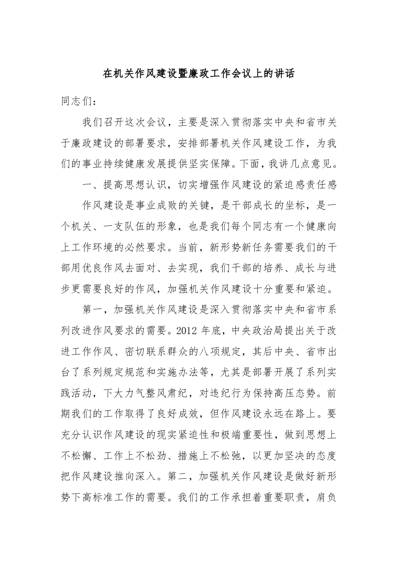 / 在机关作风建设暨廉政工作会议上的讲话稿