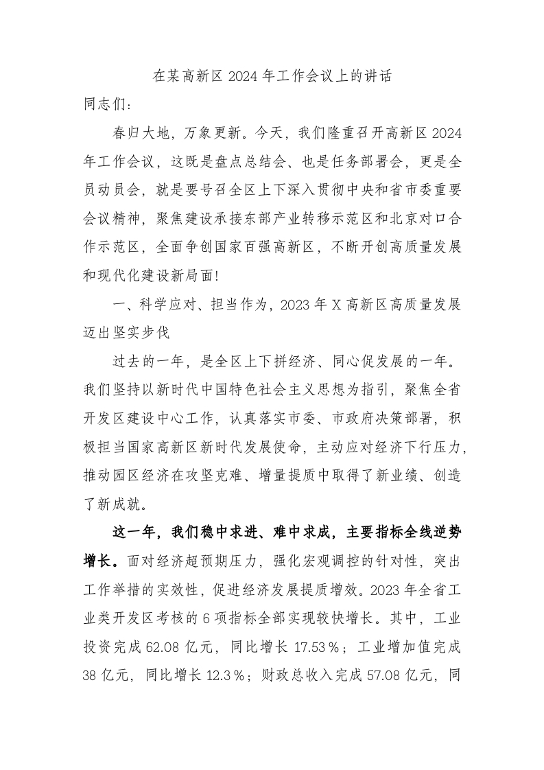 / 在某高新区2024年工作会议上的讲话