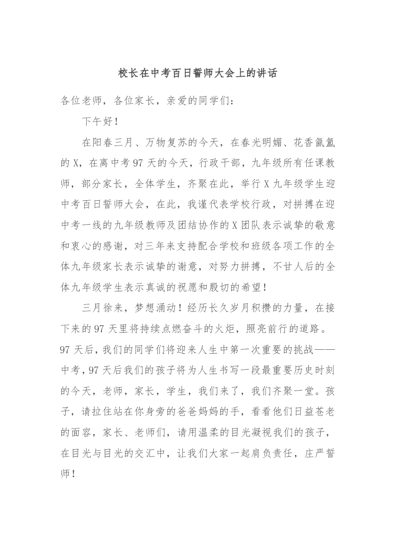 校长在中考百日誓师大会上的讲话稿