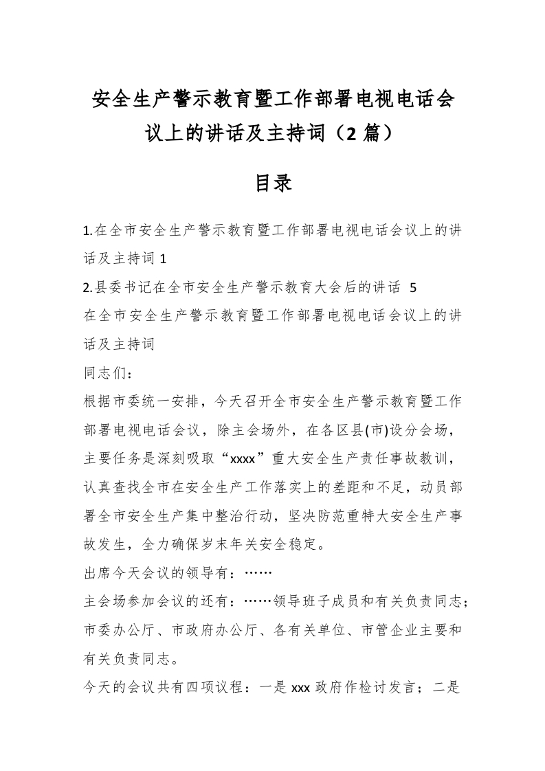 (2篇)安全生产警示教育暨工作部署电视电话会议上的讲话稿及主持词