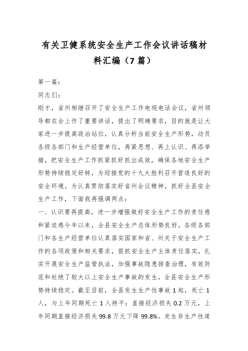 / (7篇)有关卫健系统安全生产工作会议讲话稿稿材料汇编