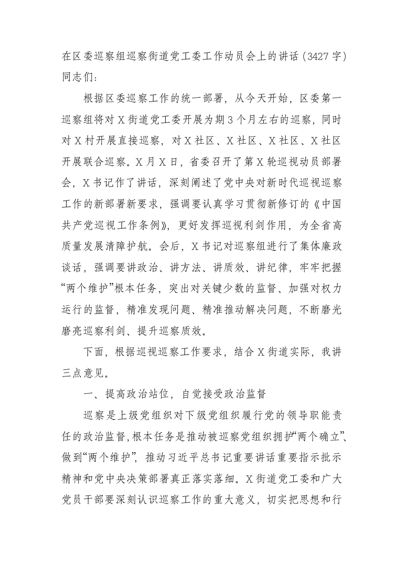/ 在区委巡察组巡察街道党工委工作动员会上的讲话