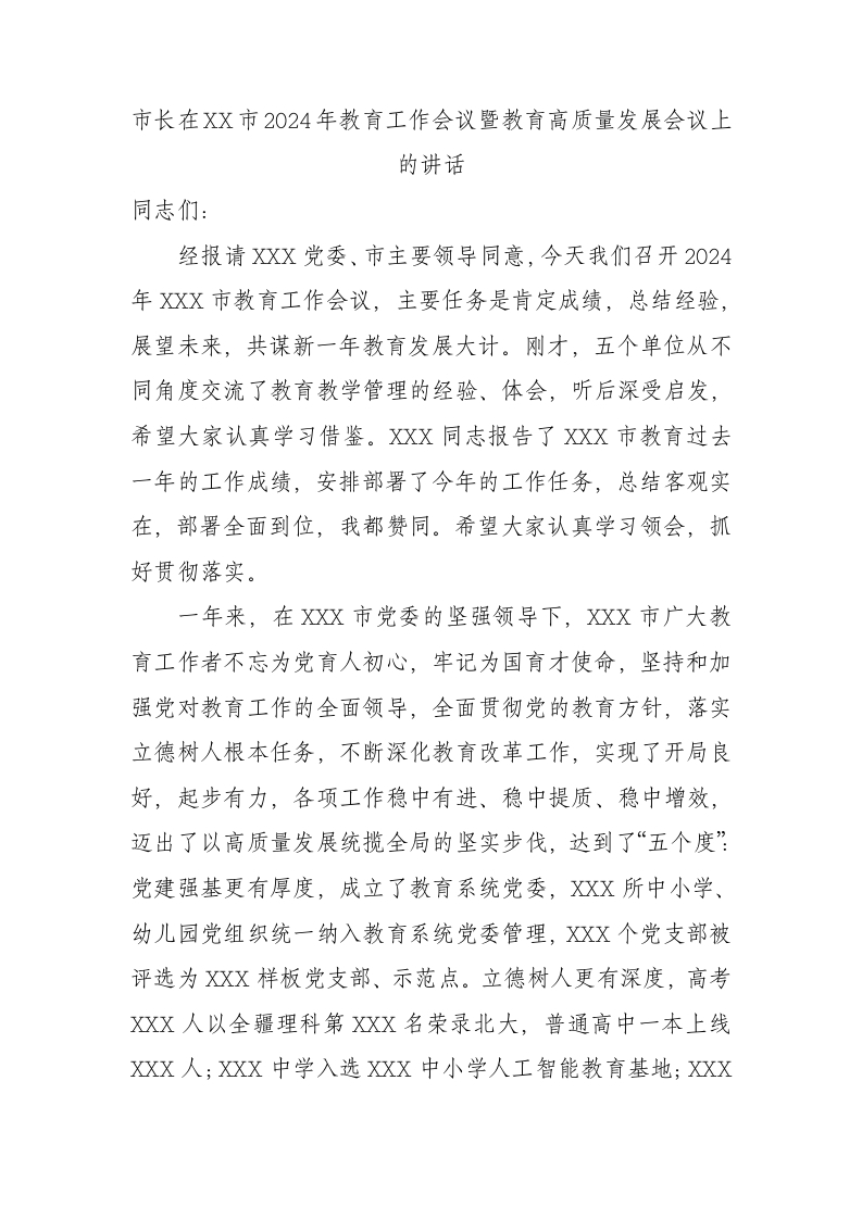 / 市长在XX市2024年教育工作会议暨教育高质量发展会议上的讲话