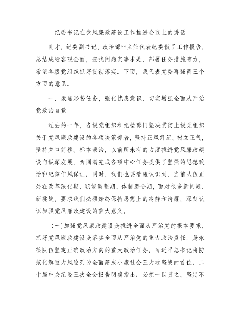 / 纪委书记在党风廉政建设工作推进会议上的讲话
