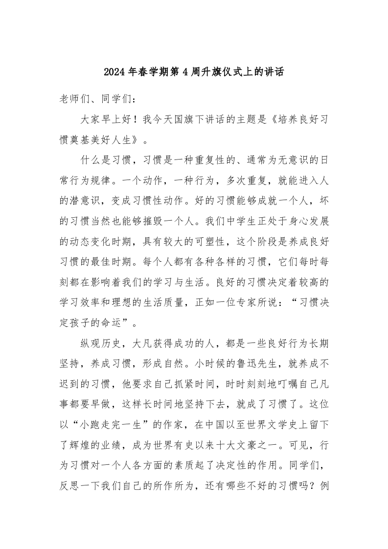 2024年春学期第4周升旗仪式上的讲话