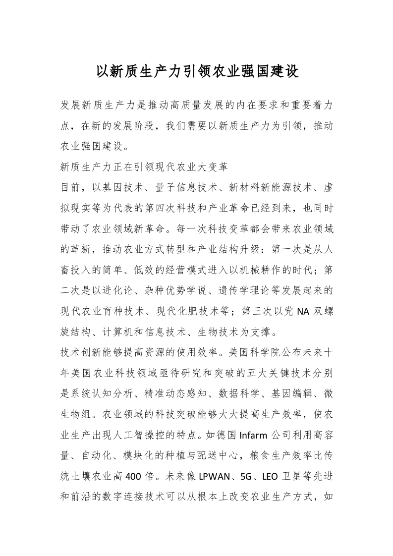以新质生产力引领农业强国建设