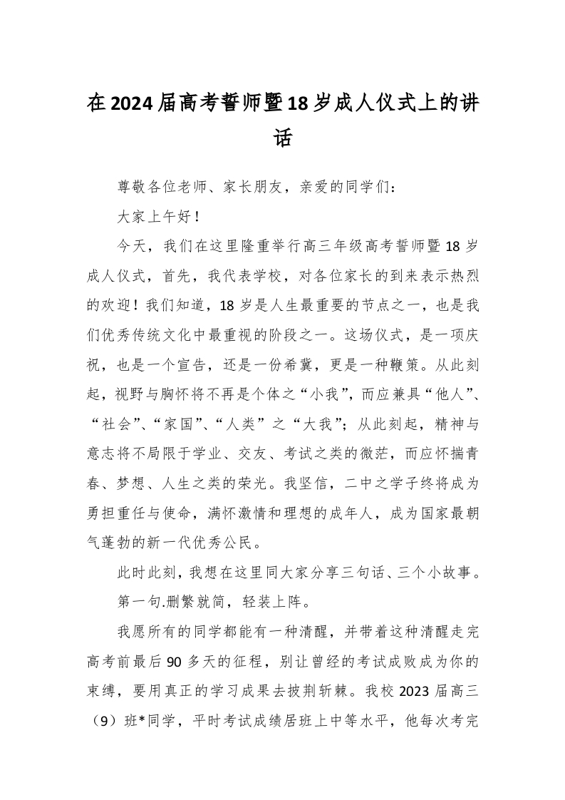 / 在2024届高考誓师暨18岁成人仪式上的讲话