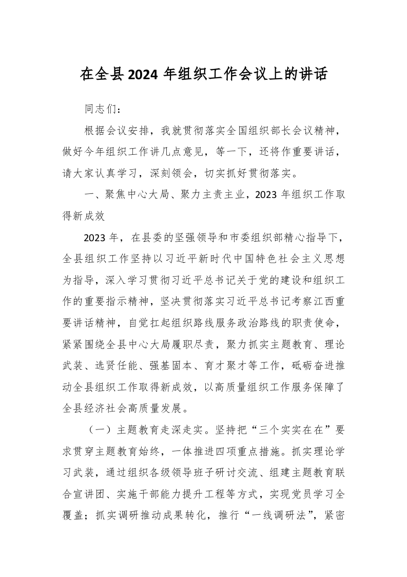 / 在全县2024年组织工作会议上的讲话