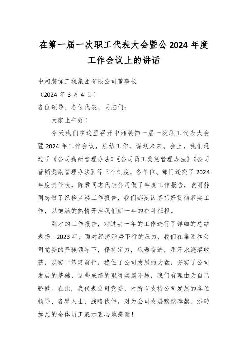 在第一届一次职工代表大会暨公2024年度工作会议上的讲话