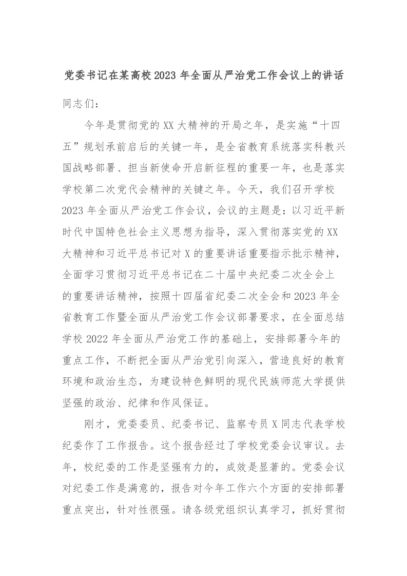 / 党委书记在某高校2023年全面从严治党工作会议上的讲话