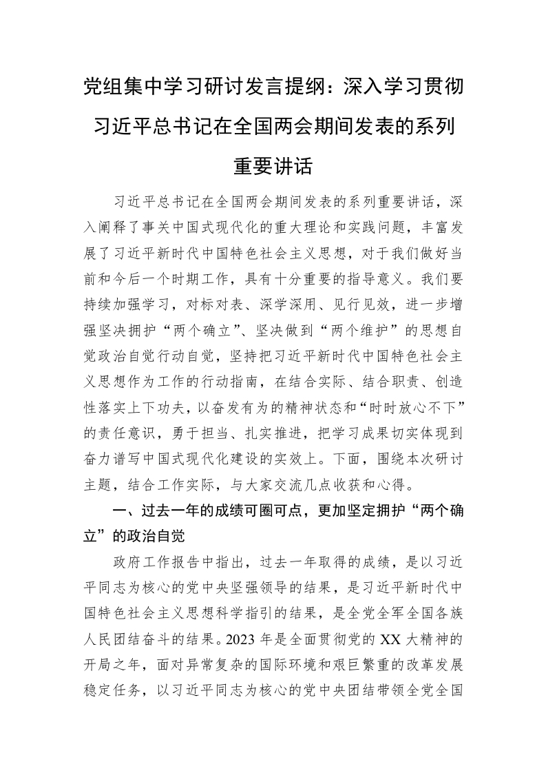 / 党组集中学习研讨发言提纲:深入学习贯彻习近平总书记在全国两会期间发表的系列重要讲话