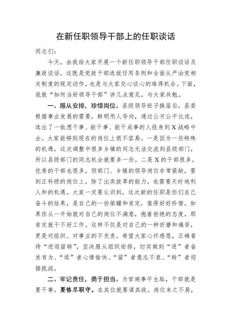 / 在新任职领导干部上的任职谈话