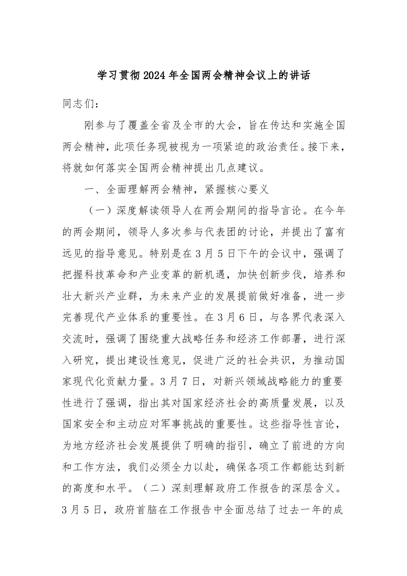/ 学习贯彻2024年全国两会精神会议上的讲话